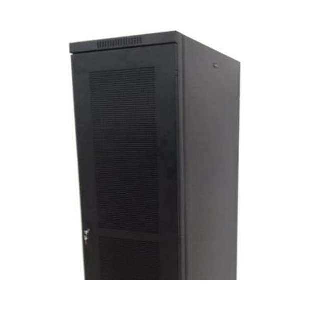 A porta frontal é perfurada, permitindo melhor ventilação dos equipamentos.