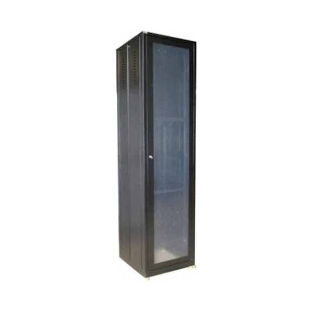 Rack de Piso - Gabinete fechado, possuindo fechadura com chave na porta frontal sendo fornecido com 2 planos de fixação. A porta frontal, a tampa traseira e as laterais são totalmente removíveis. Apresenta furações no teto para até 4 ventiladores.
