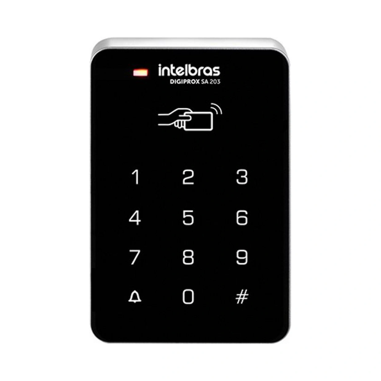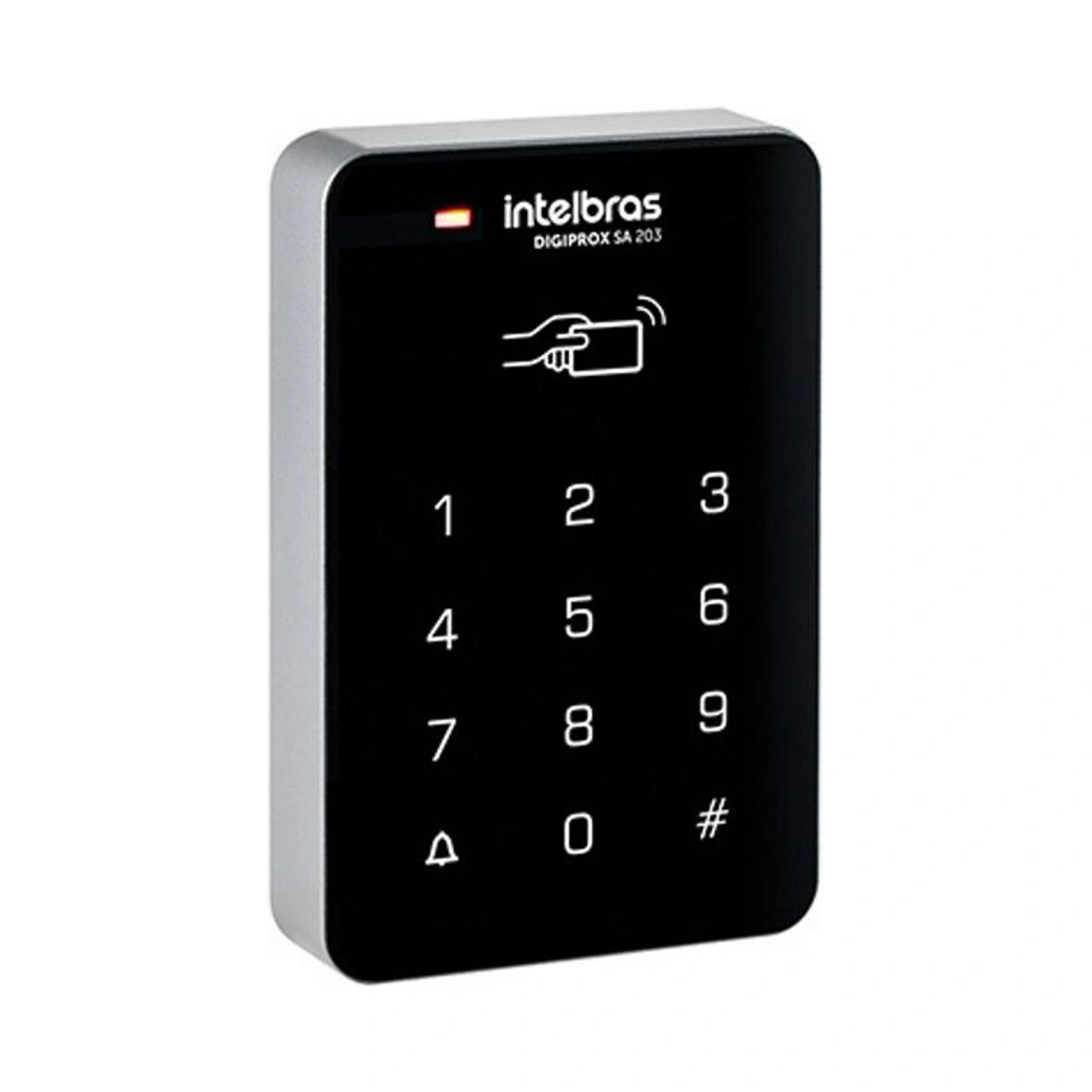 O controlador permite autenticação por senha ou cartão de proximidade RFID.
