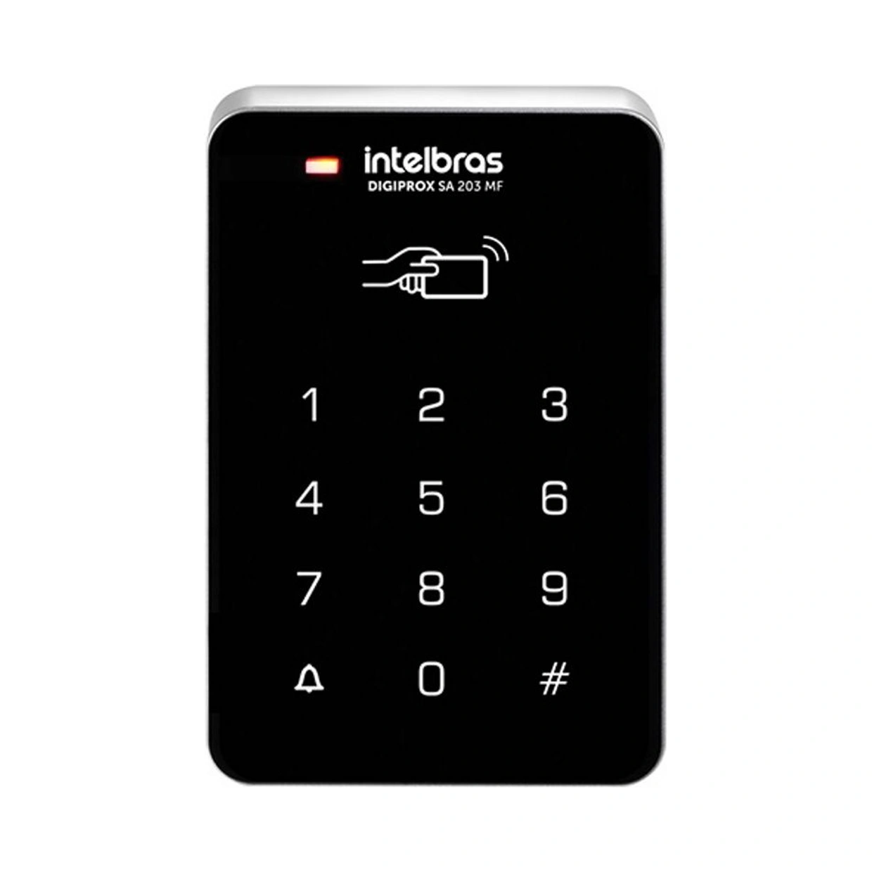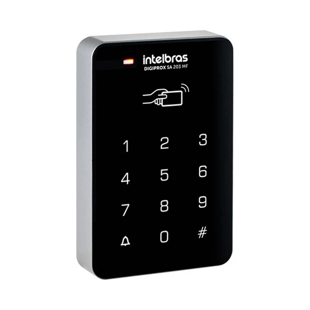 O controlador permite autenticação por cartão de proximidade RFID ou senha.