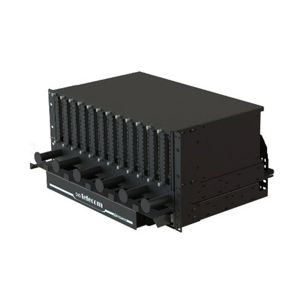 Instalado em racks padrão 19” é indicado para aplicação em redes internas com alta concentração de fibras ópticas para economia de espaço no servidor, pois acomoda até 12 módulos de distribuição e emendas com capacidade de até 12 fusões cada, totalizando 144 fibras em um espaço de 5Us. Composto por um sub-bastidor (3U), gaveta para acomodação de tubo loose/painel guia para distribuição de cordões (1U) e gaveta para reserva de cordões (1U)