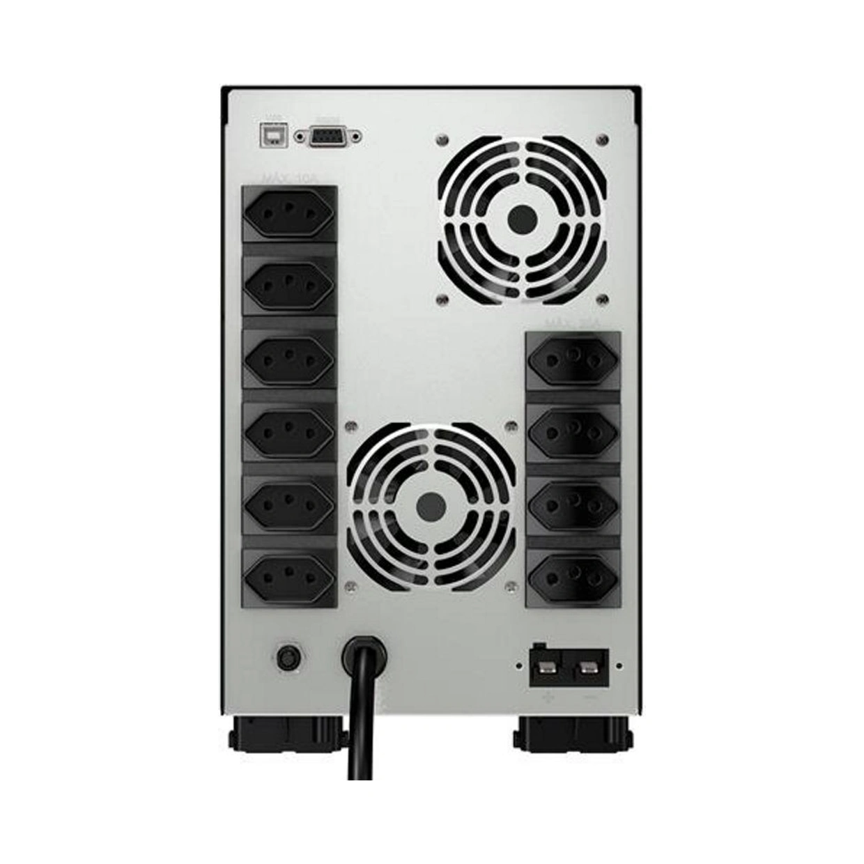 Possui 10 tomadas padrão NBR 14136, sendo 6 de 10A e 4 de 20A.