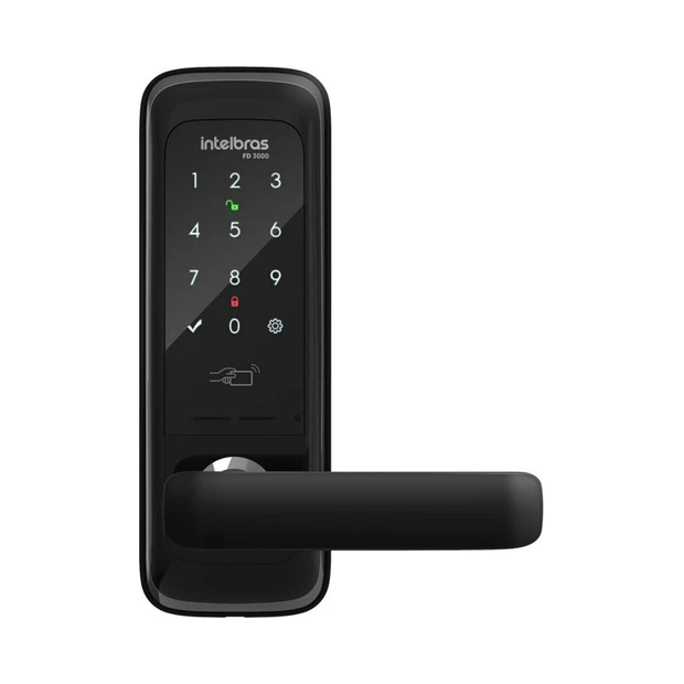 proximidade. Na FD 3000 é possivel cadastrar até 9 senhas (sendo 1 de administrador, 4 de uso diário e 4 de visitantes de uso temporário) e até 100 tags de proximidade. Conta com funções