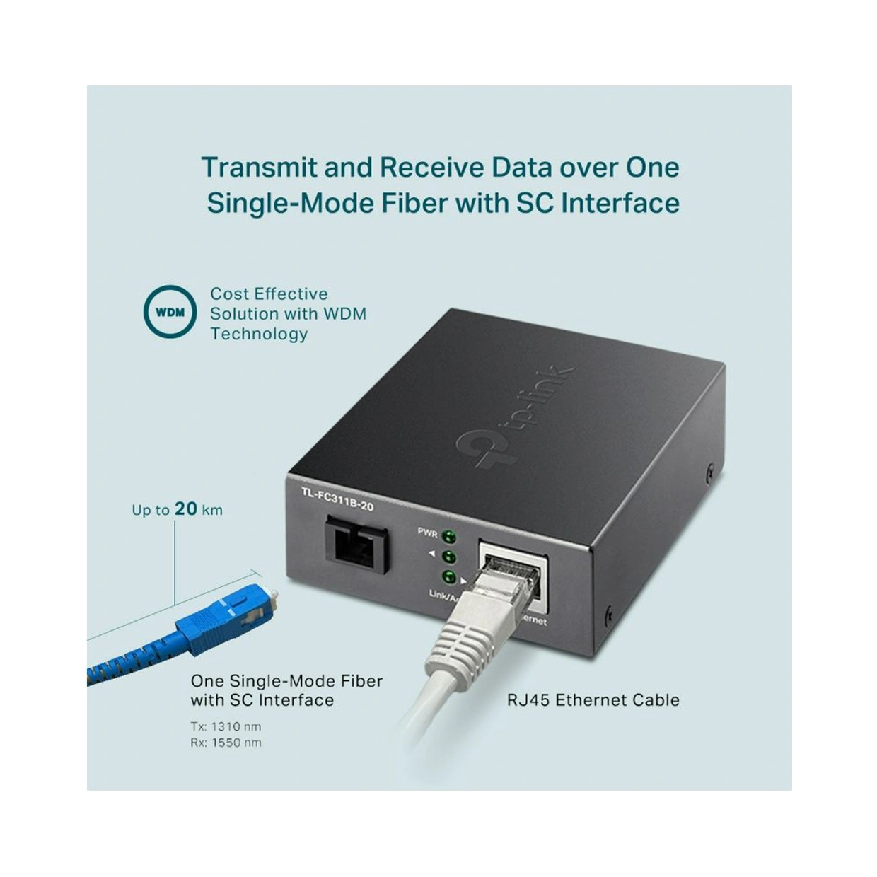 O TL-FC311B-20 adota a tecnologia WDM (wavelength division multiplexing), ajudando a enviar e receber dados a uma distância de até 20 km com apenas uma fibra monomodo, o que economiza metade do custo de implantação do cabo para os clientes. TL-FC311B-20 transmite dados em comprimento de onda de 1310 nm e recebe dados em comprimento de onda de 1550 nm em fibra óptica. Portanto, o dispositivo terminal usado em conjunto com o TL-FC311B-20 deve enviar dados em um comprimento de onda de 1550 nm e receber dados em um comprimento de onda de 1310 nm. TP-Link outro conversor de mídia TL-FC311A-20 é um dos produtos que podem cooperar com TL-FC311B-20.