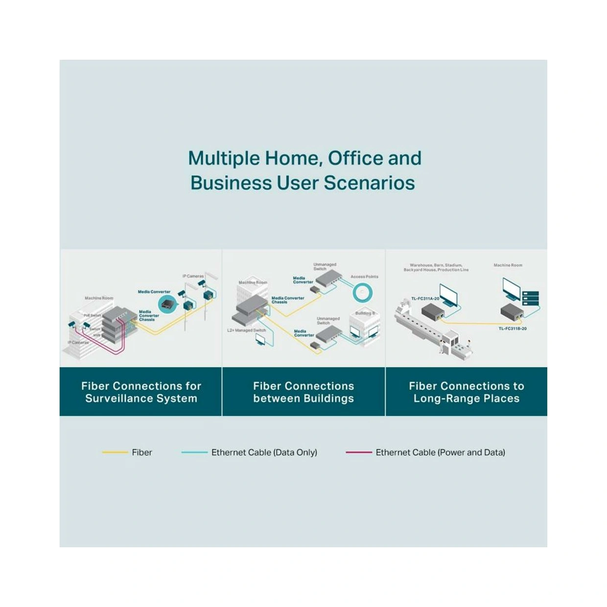 O TL-FC311B-20 é um conversor de mídia gigabit, fornecendo uma porta RJ-45 gigabit e uma porta de fibra SC gigabit, que pode converter entre sinais elétricos e ópticos. E a transmissão de dados de longa distância por meio de fibra óptica pode ser aplicada a cenários comerciais, como monitoramento de segurança de parques e redes sem fio.