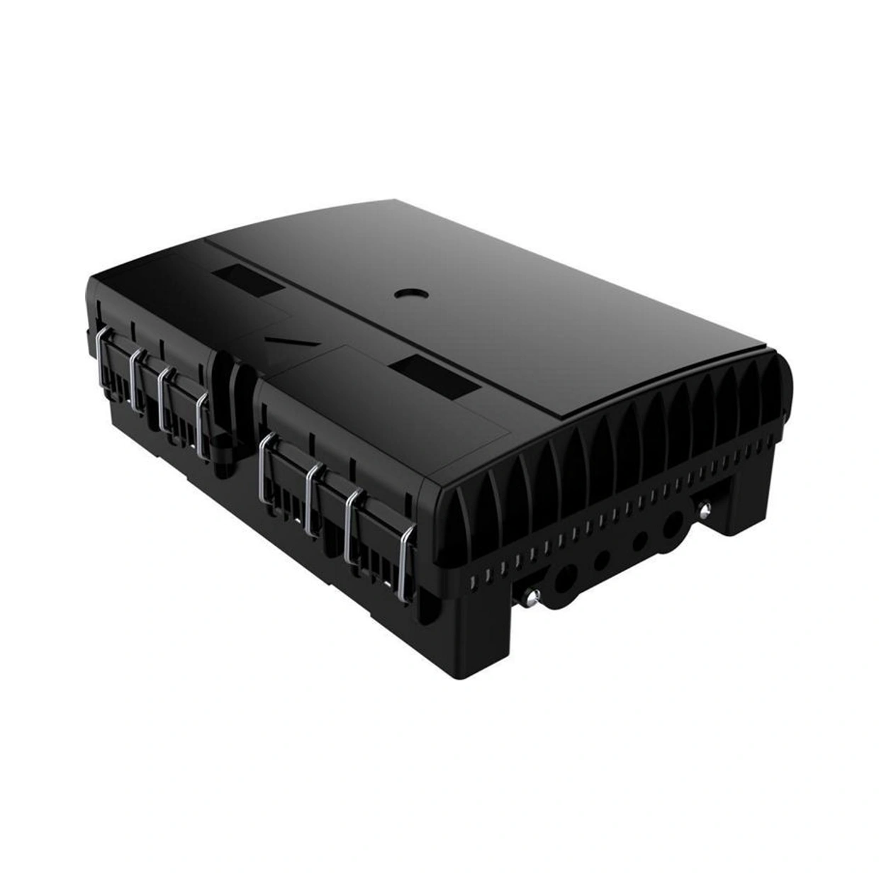 Aceita cabo de entrada por sangria com diâmetro de até 12mm, e saídas de 24 cabos drop flat.