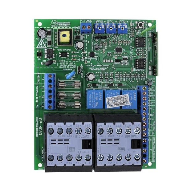 A CP 4030 É A CENTRAL PARA MOTORES MONOFÁSICOS E TRIFÁSICOS DE TENSÕES DE 220/380V. ESSA CENTRAL CONTA COM FONTE CHAVEADA, MAIS CONHECIDA COMO FONTE AUTOMÁTICA, QUE IDENTIFICA AUTOMATICAMENTE A TENSÃO DE ENTRADA. ROBUSTA CONTRA OSCILAÇÕES DE ENTRADA DE ALIMENTAÇÃO, ESSA CENTRAL PERMITE QUE A REDE ELÉTRICA POSSA TER VÁRIAS TENSÕES, SEM AFETAR A TENSÃO DE SAÍDA QUE ALIMENTA TODO O CIRCUITO DIGITAL. A CENTRAL ELETRÔNICA CP4030 PERMITE A LIGAÇÃO DE MÓDULOS EXTERNOS E FOTOCÉLULAS PODENDO SER CONSUMIDO ATÉ 400MA. CAPACIDADE DE CONFIGURAÇÃO DE A TÉ 250 CONTROLES. NESSA CENTRAL ELETRÔNICA PODEMOS TER OPÇÕES DE: FECHADURA MAGNÉTICA, LUZ DE CORTESIA E SINALEIRA. A FUNÇÃO CONTA FILA PODE SER UTILIZADA EM CONDOMÍNIOS ASSOCIADA A CANCELAS. CP4030 É COMPATÍVEL COM TODOS OS CONTROLES REMOTOS NICE COM A TECNOLOGIA ROLLING CODE.