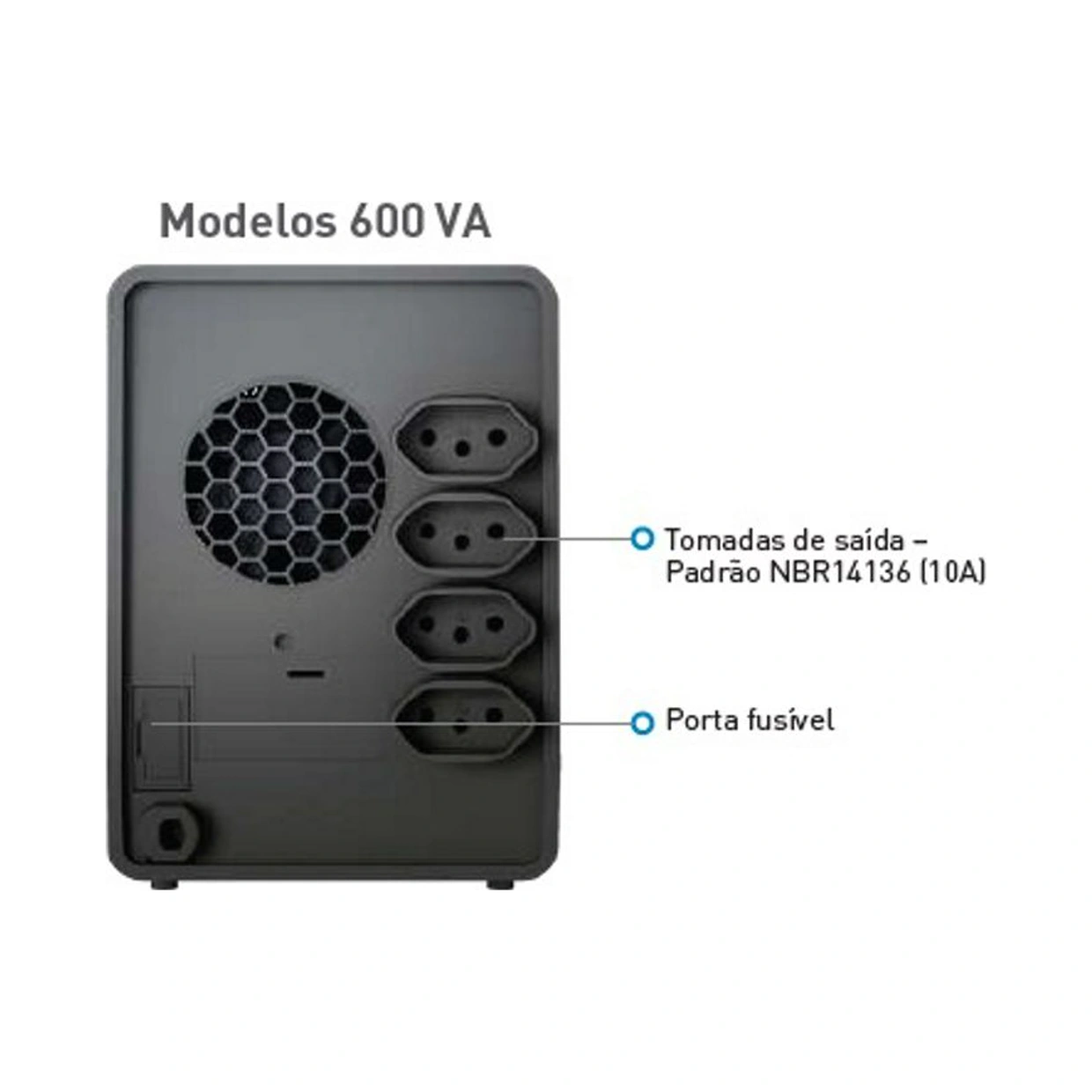 › Alarme audiovisual para queda de rede, subtensão, fim do tempo de autonomia, final de vida útil da bateria, sobretensão, potência excedida e sobretemperatura.