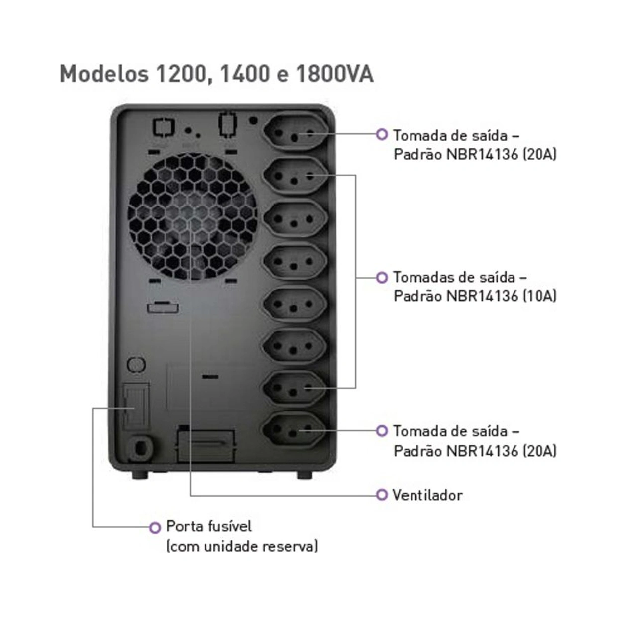› Alarme audiovisual para queda de rede, subtensão, fim do tempo de autonomia, final de vida útil da bateria, sobretensão, potência excedida e sobretemperatura.
