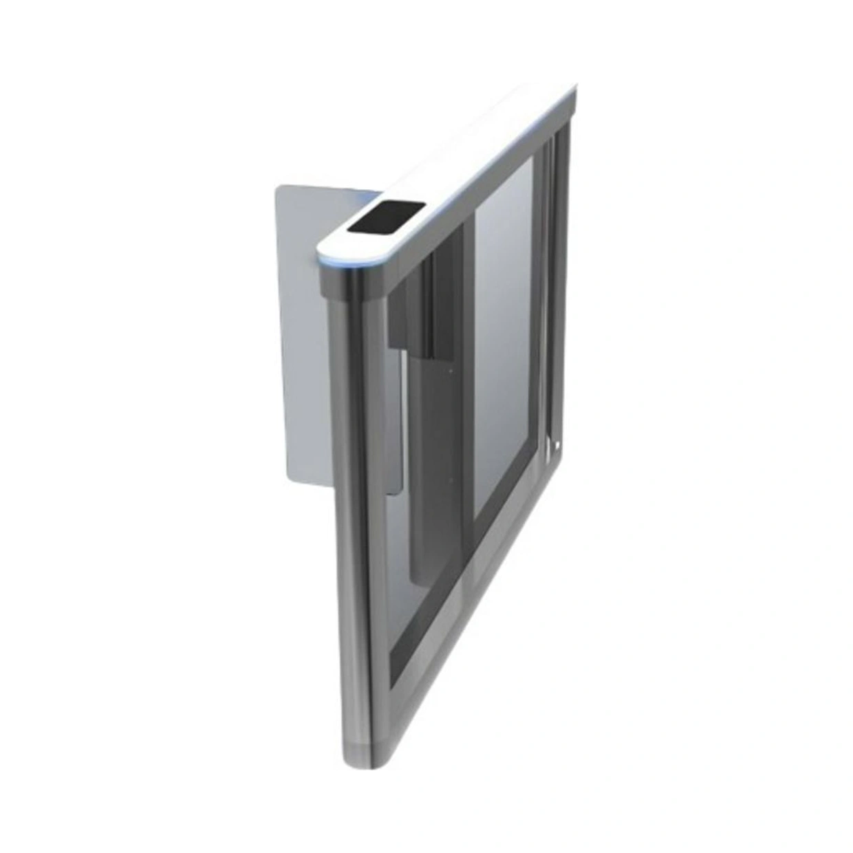 Catraca tipo Gate da série 9000. Produto em aço inox 304 com acabamento em mármore branco sintético com suporte para leitor RFID. Para uso em ambientes internos cobertos.