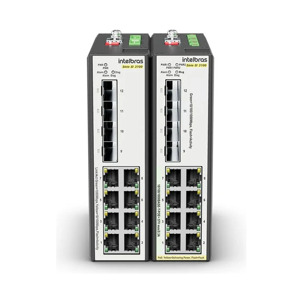 O switch possui 8 portas Gigabit e 4 portas SFP para uplink.