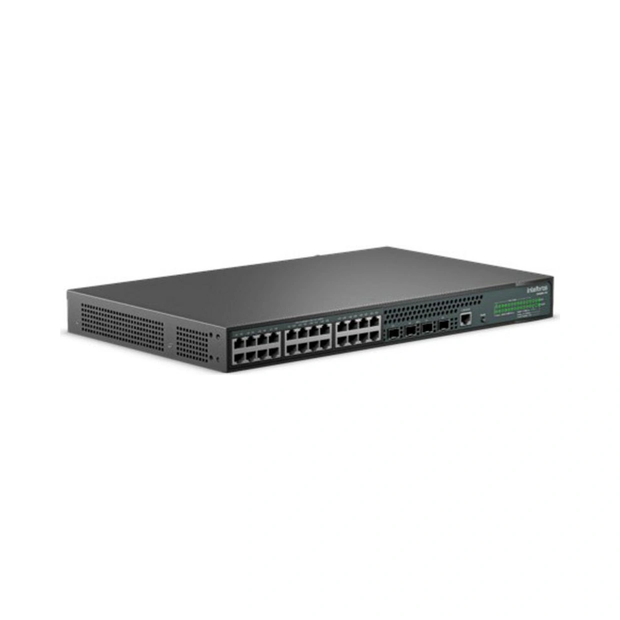 O switch possui 24 portas Gigabit Ethernet PoE e 4 portas SFP+ de 10 Gbps.