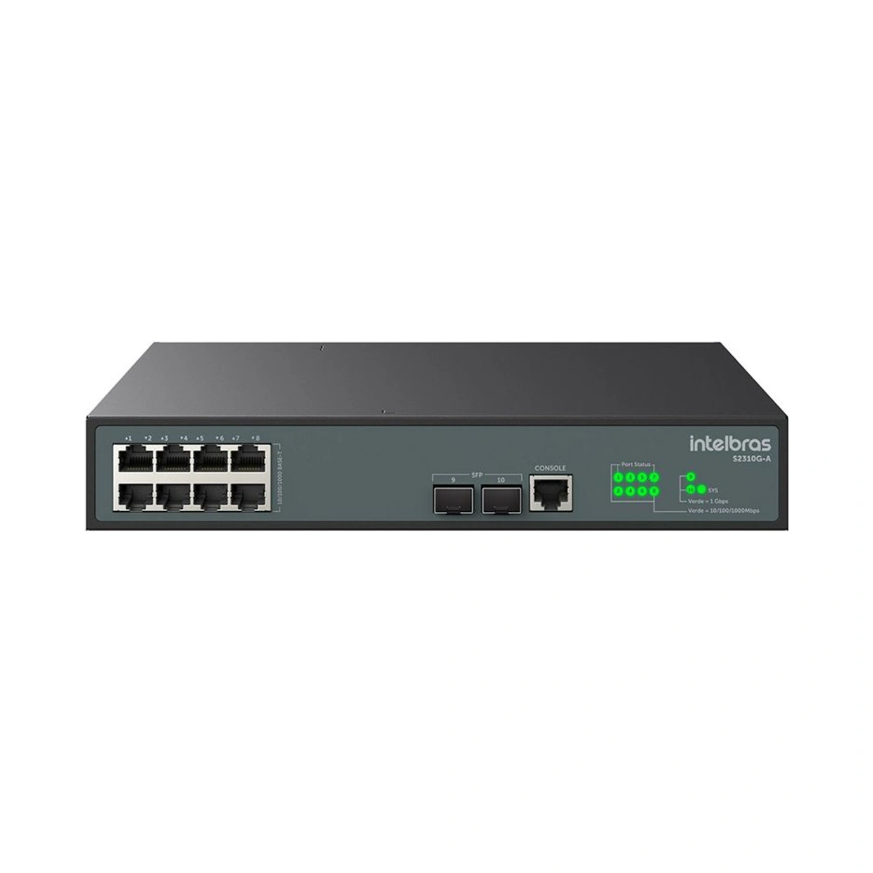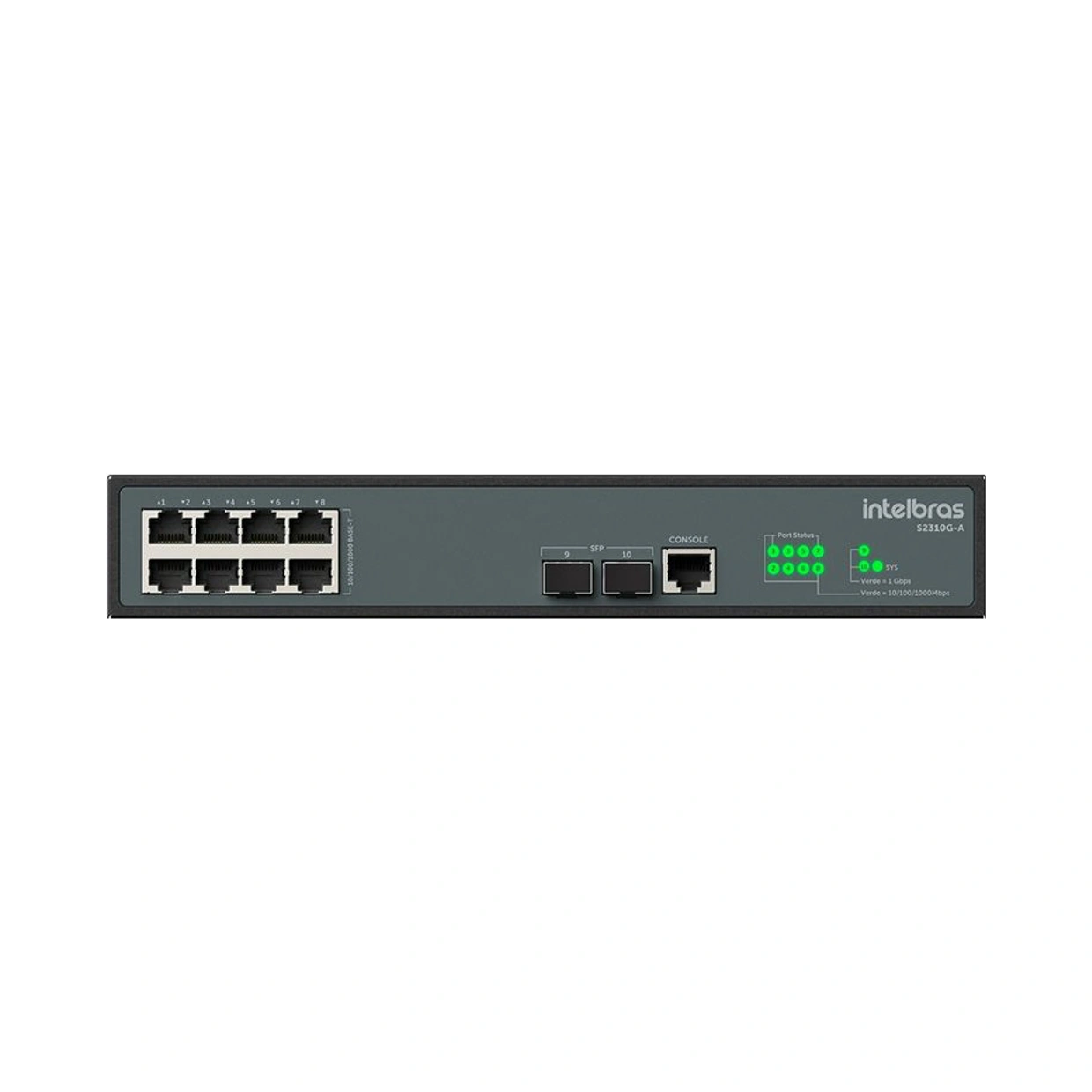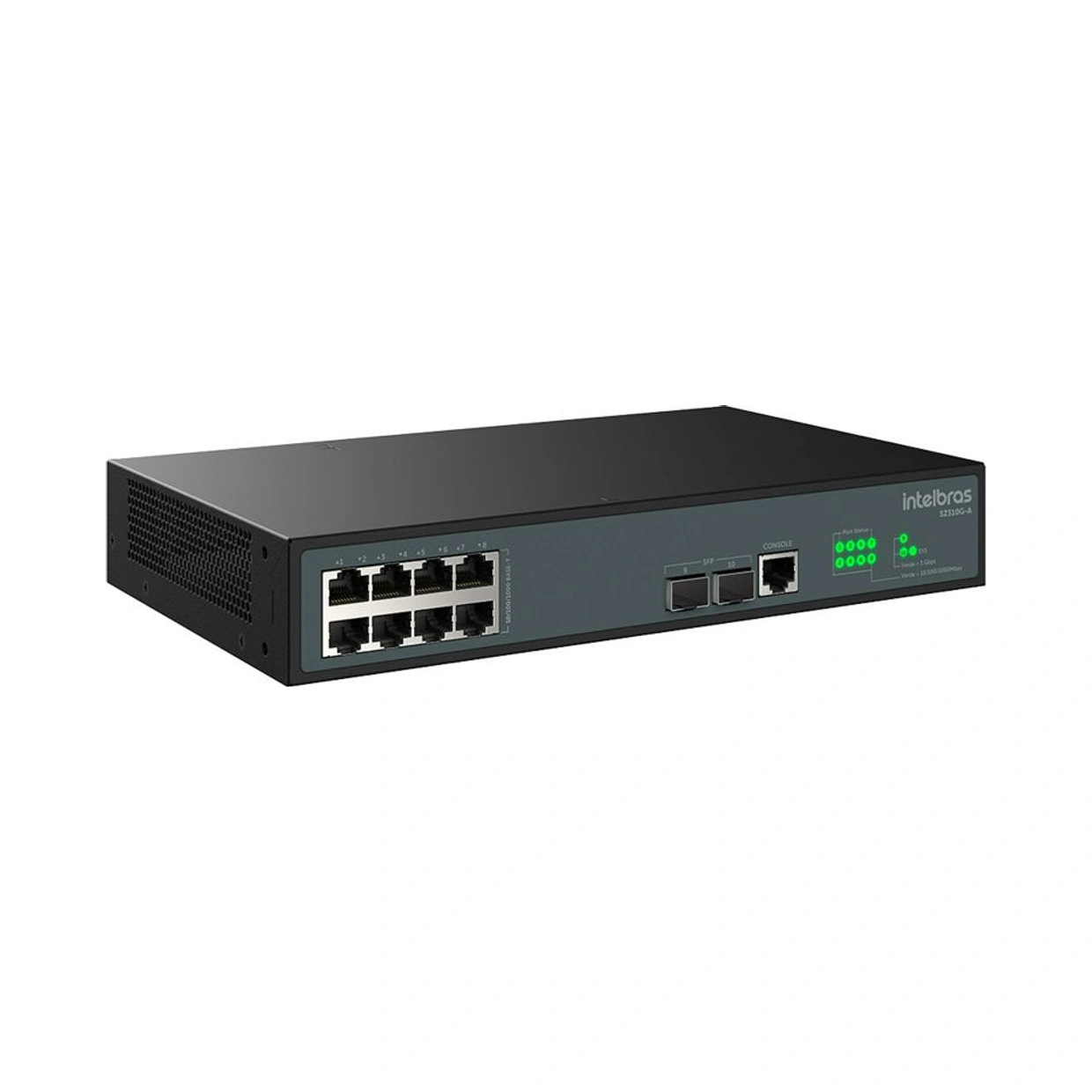 O switch possui 8 portas Gigabit Ethernet 10/100/1000 Mbps e 2 portas SFP.