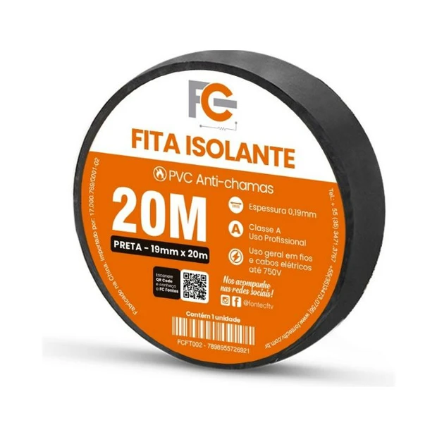 Fita isolante para uso profissional para Isolação De Fios E Cabos Elétricos Em Geral Até 750 V. Fabricada em PVC anti-chamas, com ótima elasticidade e resistência. Ideal Para Isolação De Cabos Elétricos, proporcionando uma perfeita isolação, sem risco de choques elétricos. Atua Como Uma Camada Protetora Contra Raios Ultravioleta.