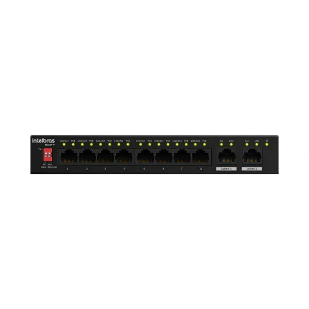 O switch possui 8 portas Fast Ethernet PoE e 2 portas Uplink.
