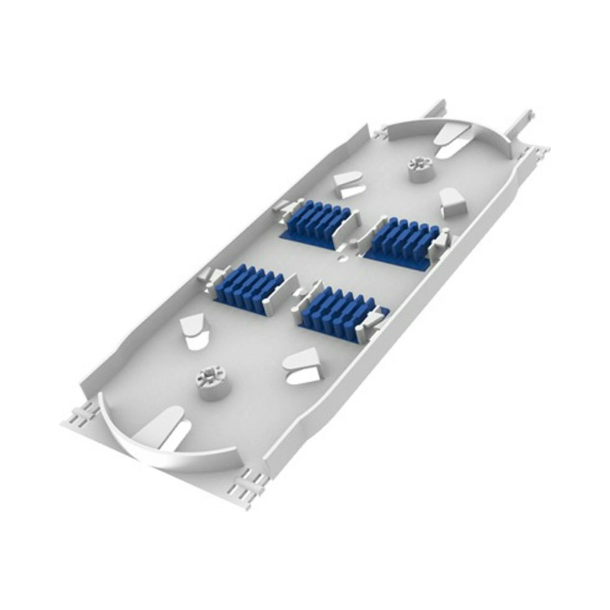 A bandeja comporta até 24 fusões de fibras ópticas.