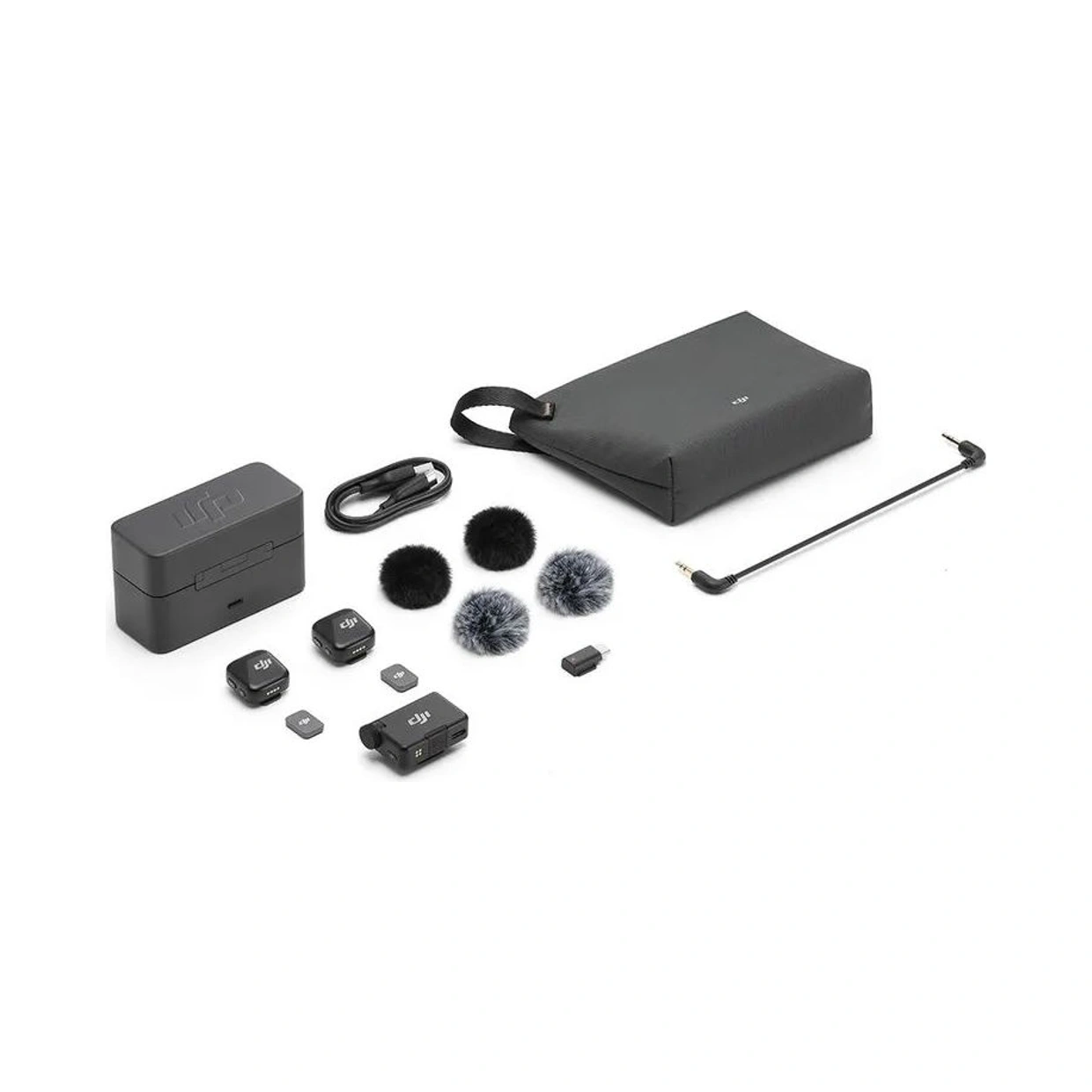 O kit inclui 2 microfones transmissores, 1 receptor, case de carregamento, adaptadores, presilhas, protetores de vento e bolsa de transporte.