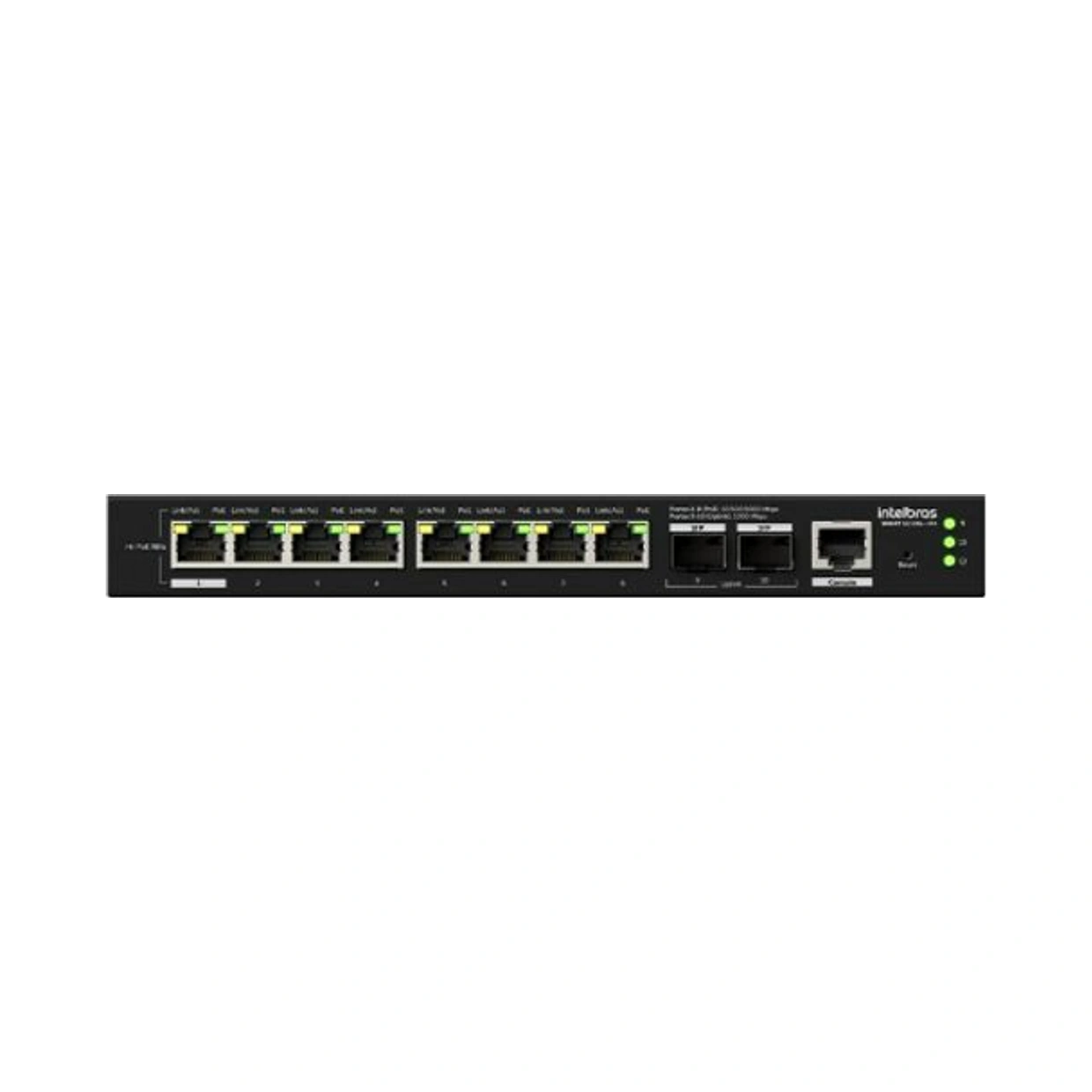 - Possui 8 portas Gigabit Ethernet PoE, sendo também Hi-PoE na porta 1, e 2 portas SFP 1 GB.