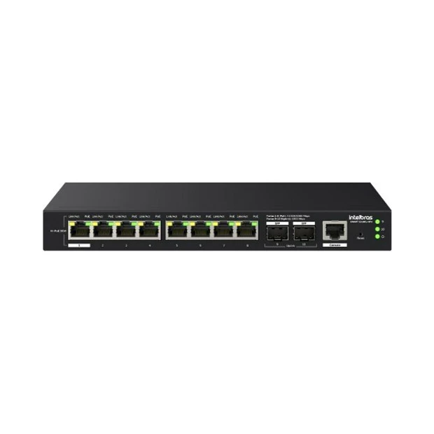 O switch possui 8 portas Gigabit Ethernet PoE e 2 portas SFP de 1 GB.