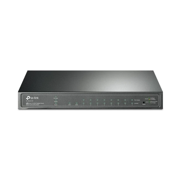 - Portas Gigabit: 8× portas gigabit PoE+ e 2× SFP Slots que fornecem conexões de alta velocidade.